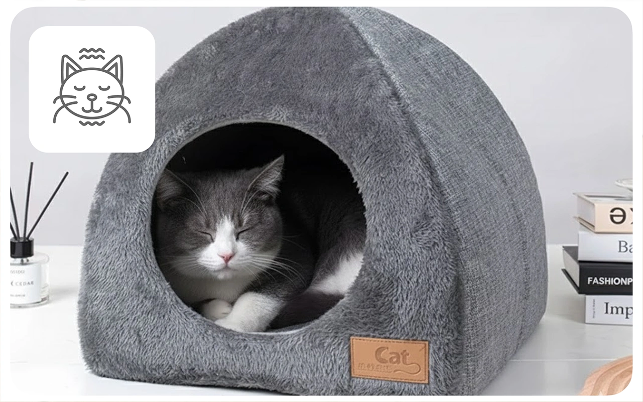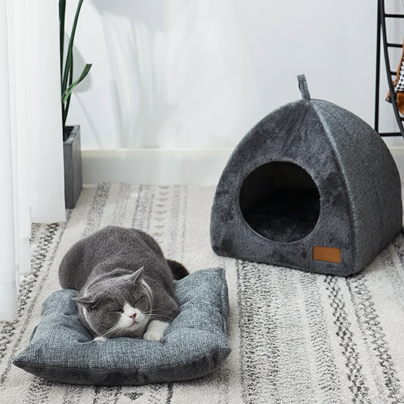 Den triangulära formen skapar avskildhet och minskar snabbt stress och oro. Katter känner sig skyddade inuti och njuter av lugna stunder när det behövs.