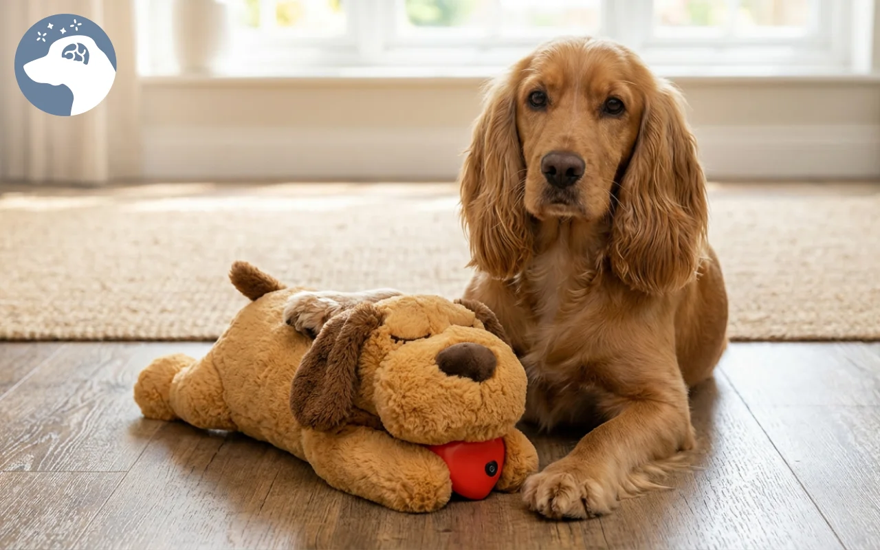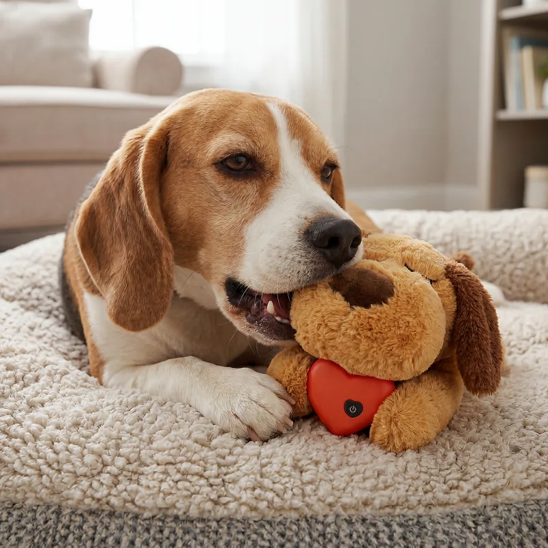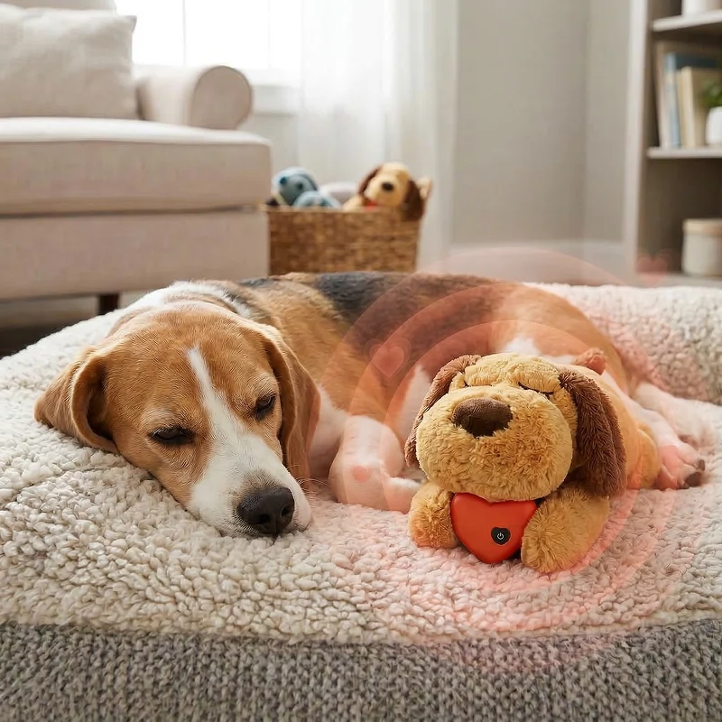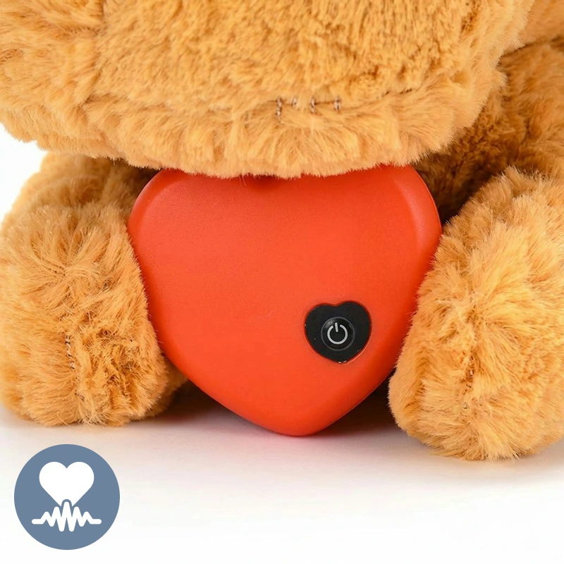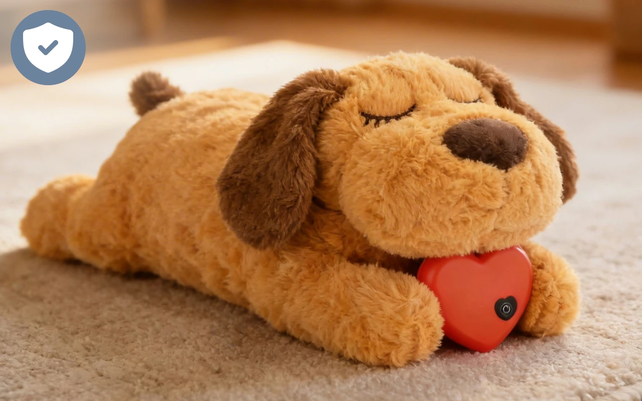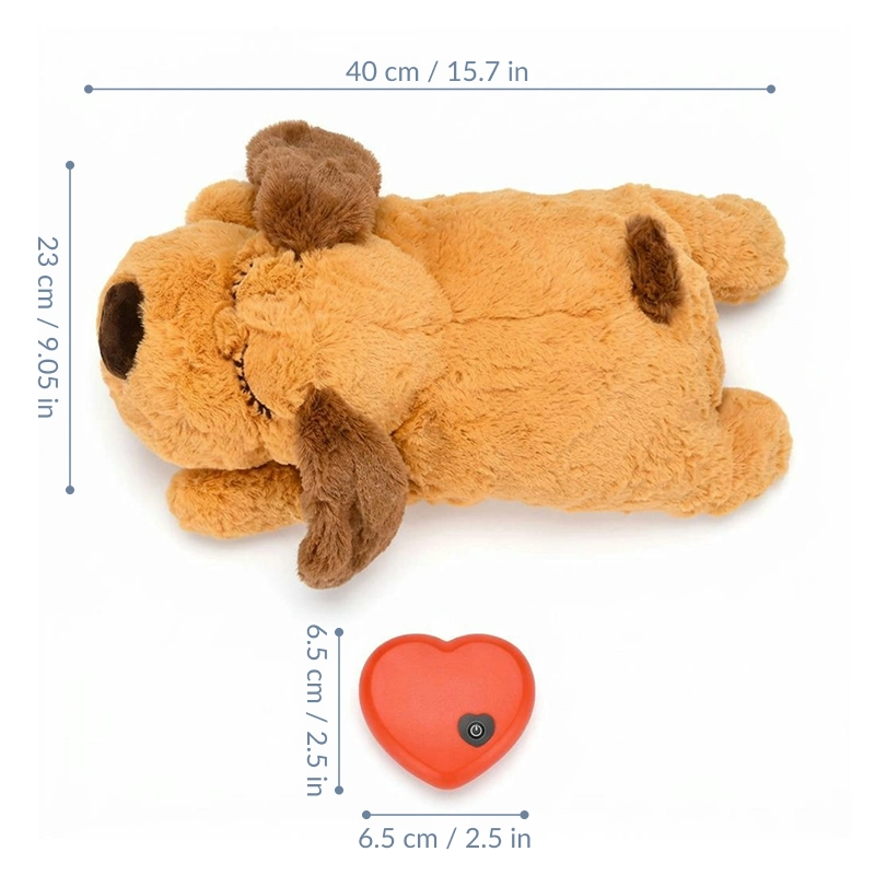 Vår nya valp gjorde gosedjuret till sin bästa vän. Det mjuka hjärtslaget lugnar honom, särskilt när det åskar. Har inte haft en sömnlös natt sedan dess.