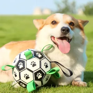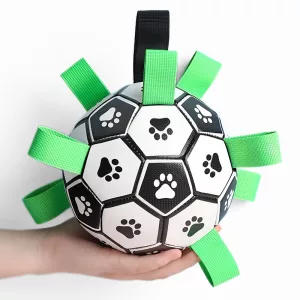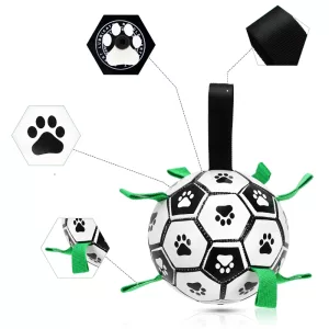 Jag gillar hur denna fotboll hjälper vid träning. Flikarna gör det lätt att leka dragkamp och apport utan att tappa greppet.