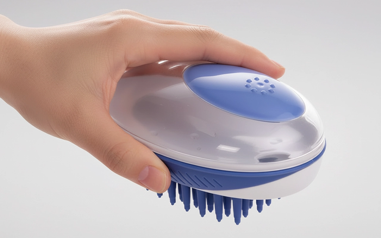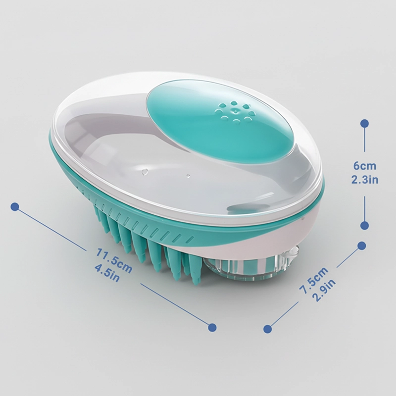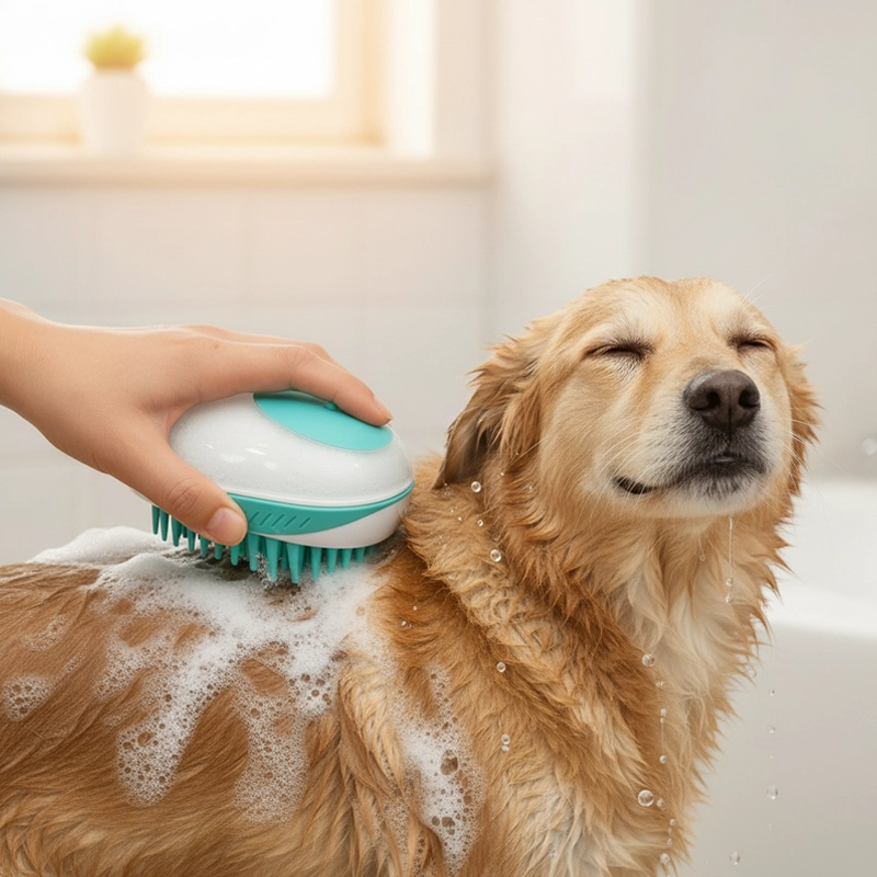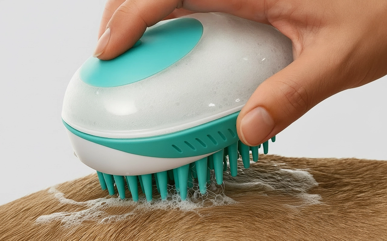 Den här lilla borsten gör badstunden så enkel. Jag bara häller i schampo, klämmer, och det löddrar direkt. Min valp är lugn hela tiden.