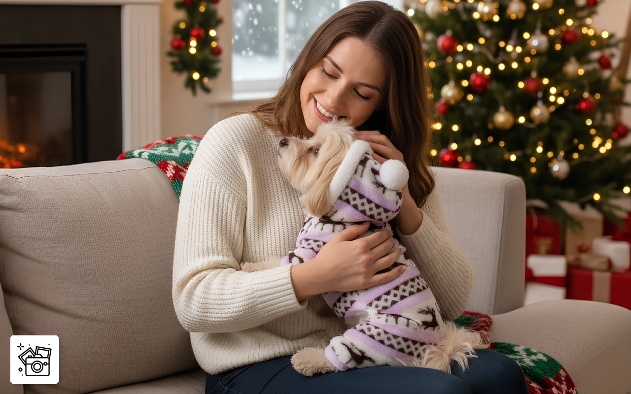 Glatt julmotiv sprider glädje vid varje sammankomst. Ta perfekta festbilder med ditt husdjur klätt för skoj.