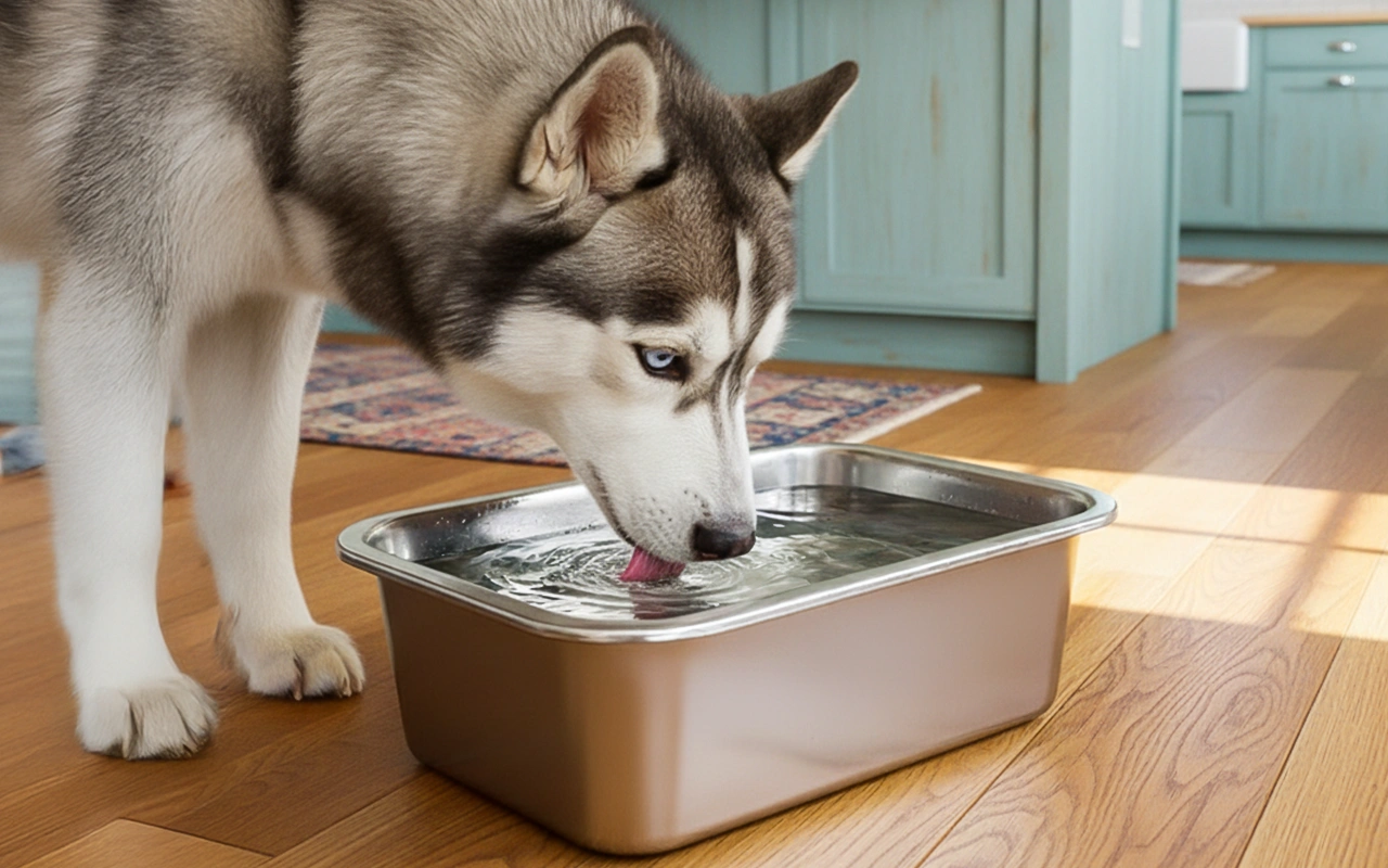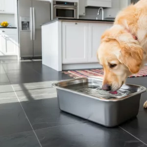 Vår schäfer dricker mycket och den här håller henne nöjd. Jag gillar hur den ser ut på köksgolvet, snygg och blank.