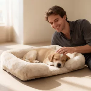 Den mjuka kudden hjälper min omplaceringshund att vila lugnt även när vi har gäster. Hon gömmer sig inte längre, bara kurar ihop sig på sin bekväma plats. Och lätt att rengöra.
