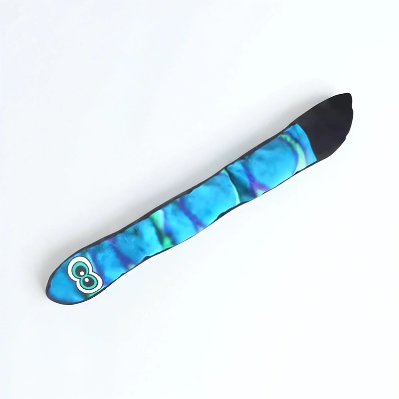 Min valp blir superglad så fort han ser den färgglada ormen. Materialet är skonsamt mot tänderna och han leker i timmar utan att bli uttråkad.