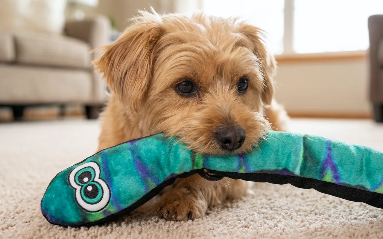 Vår beagle gillar verkligen den pipande orm-leksaken.