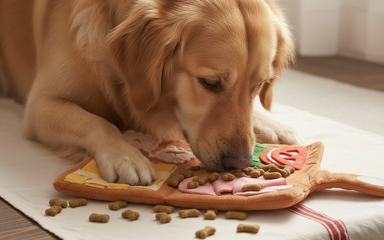 Vår golden retriever brukade vara uttråkad inomhus, men nu blir hon helt uppslukad av att leta på sin matta. Hon nosar länge och verkar alltid nöjd.