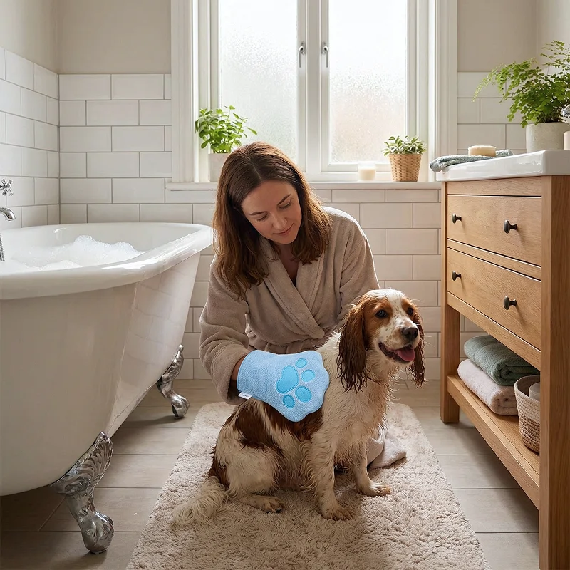 Slipper äntligen jaga blöta tassavtryck! Handsken suger upp så mycket vatten direkt och känns behaglig för min hund. Den är lätt att rengöra och förvara.