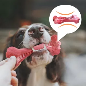 Denna tuggleksak är smaksatt med köttig smak och oemotståndlig för hundar. Det är som en godbit men utan extra kalorier.