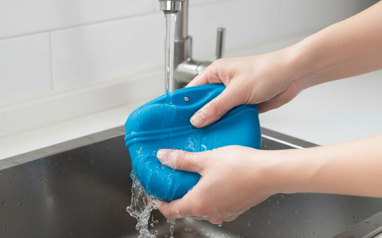 Diskning tar några sekunder, så påsen förblir fräsch och hygienisk. Silikonet vänds ut och in för noggrann sköljning vid varje användning.