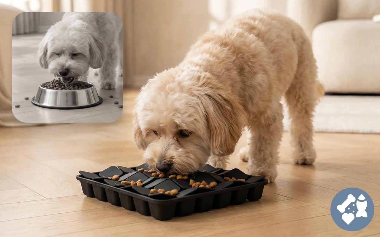 Husdjur tar mindre tuggor, vilket förhindrar farlig hetsätning eller olyckor. Långsammare ätande innebär mindre risk för magont efter måltid.