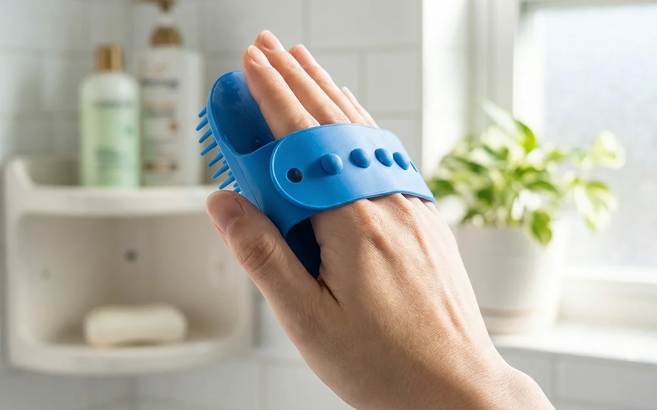 Små gummiknoppar lugnar huden vid skrubbning och lindrar spänningar varsamt. Husdjur får extra omvårdnad och tvätten blir en mysig stund.