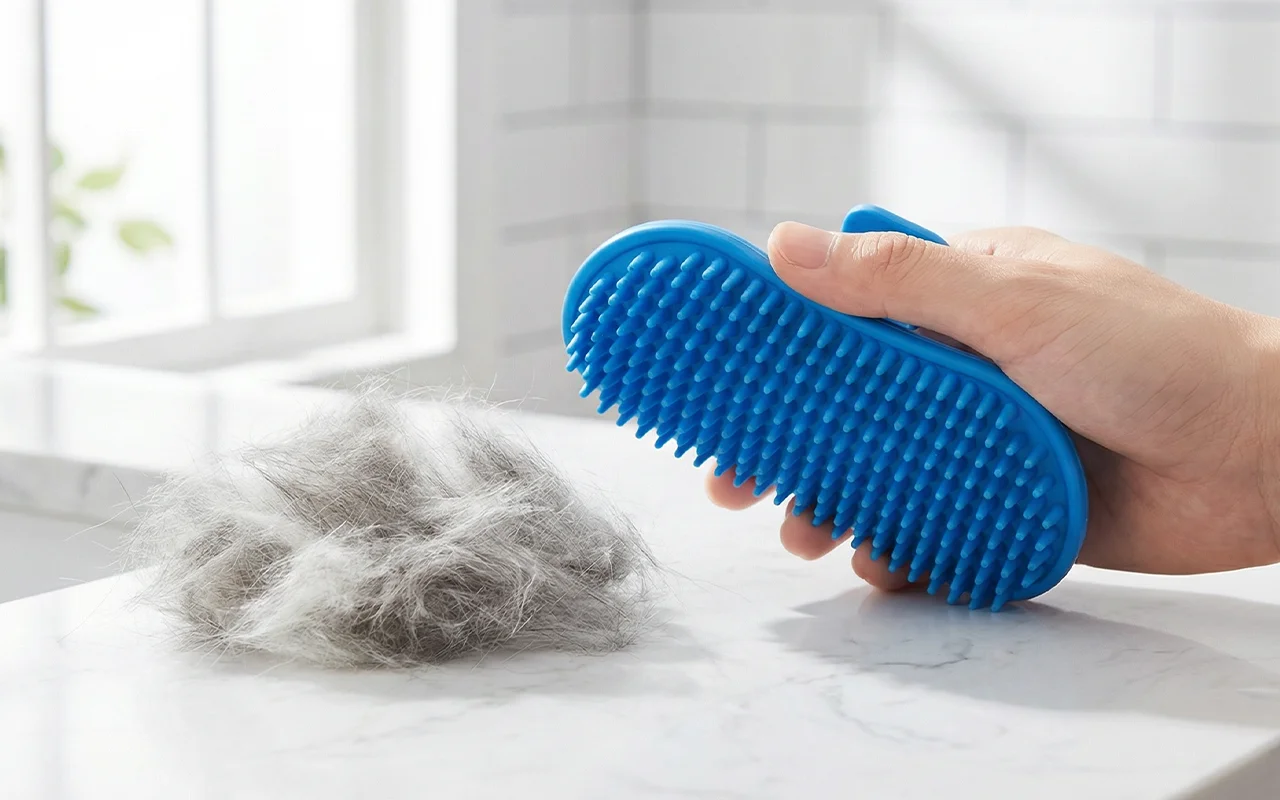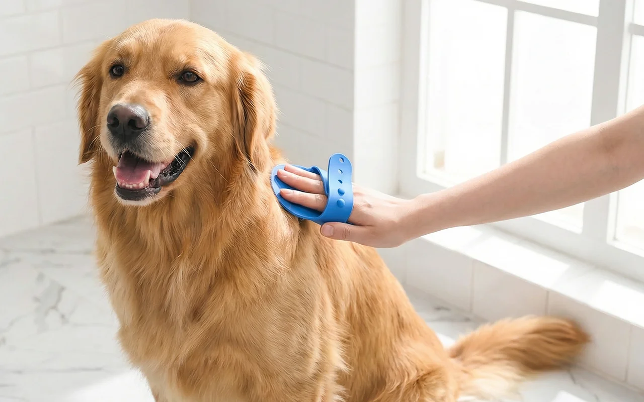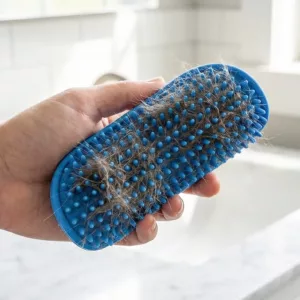 Min hund brukade gömma sig vid badet men nu kommer hon springande! Skrubbaren är bekväm och hjälper till att ta bort massor av lös päls.