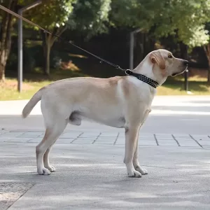 Jag gillar hur tåligt halsbandet känns men det är inte strävt mot min hunds hals. Nitarna får min corgi att se tuff ut, och det håller även i regn.