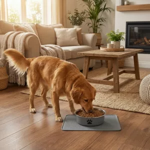 Ingen mer mat som flyger överallt! Min hund äter lugnt nu eftersom skålen faktiskt står kvar. Lätt att rengöra och ser snygg ut i vårt kök.